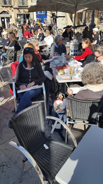 Suite à un changement de programme inopiné, quel bonheur de dessiner en extérieur Place de l'Hotel de ville. Nous ne sommes pas les seules à apprécier ce doux soleil !