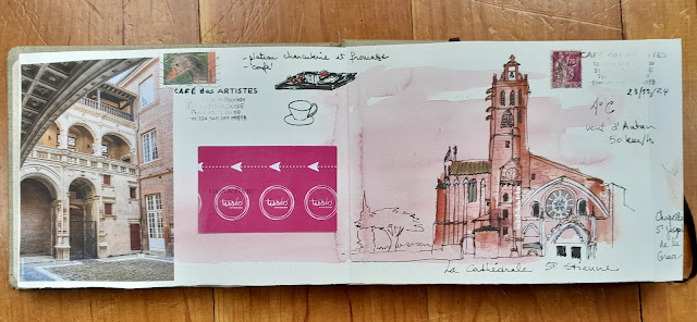 Un séjour avec une amie croqueuse, non loin de Toulouse - la ville rose, la cité des violettes la cité mondine - souvent à cette saison revêtue d'un tenace brouillard. Quelques jours donc en Occitanie, dans une charmante et chaleureuse maison, au bord du bucolique canal du Midi. Quelques pages de mon carnet souvenir (leporello fait maison qui déplié doit faire presque 3 mètres - et en recto/verso bien sur !) :