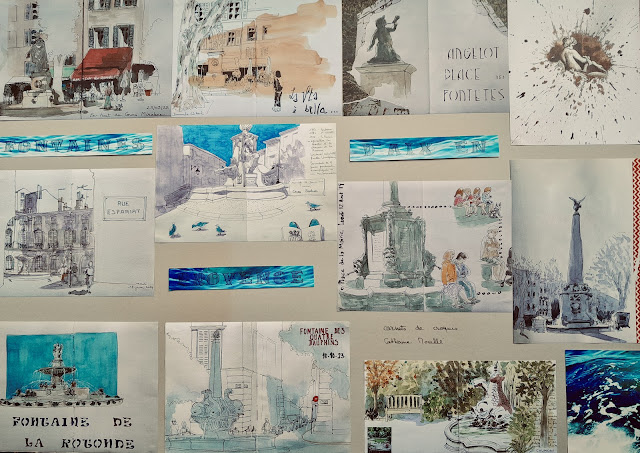 Quelques pages de carnet des fontaines d'Aix pour l'expo des AIA (sur le thème de l'eau) :